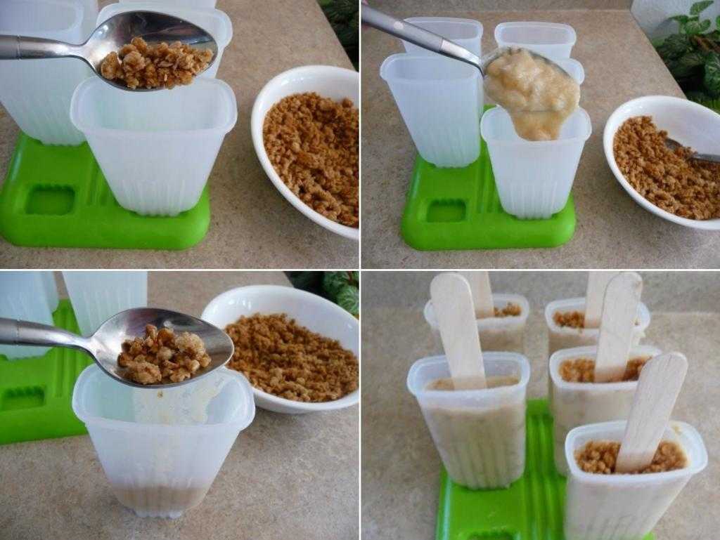 Итак, начните формировать десерт. Для начала в формочку для мороженого положите половину чайной ложки хрустящей овсяной крошки. Сверху налейте пару столовых ложек яблочной смеси. Слегка постучите формочкой об стол, чтобы смесь равномерно распределилась и внутри не было пузырьков воздуха.