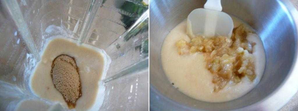 Не выключая блендер, постепенно вливайте яблочный соус. По текстуре смесь должна напоминать жидкое яблочное пюре.