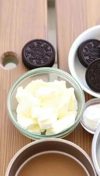 Для основы: 200 г печенья Орео (без крема), 80 г сливочного масла (размягченного). Для крема: 400 г творожного сыра (типа Филадельфия), 200 мл жирных сливок (33-35%), 100 г сахарной пудры (или по вкусу), 10-12 печенек Орео (измельченных). Убедитесь, что все ингредиенты комнатной температуры.