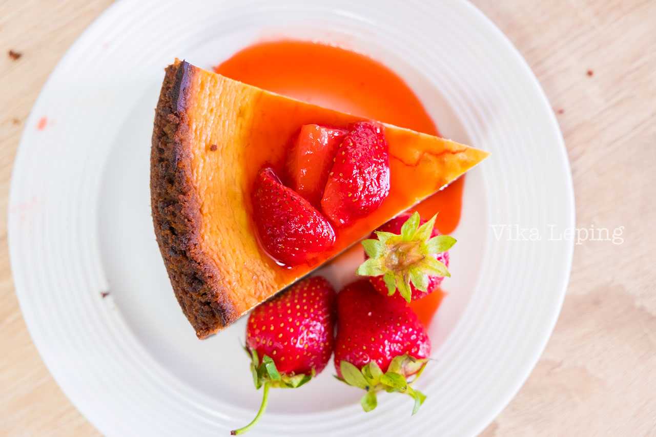 - При подаче отрезаем классический Чизкейк, поливаем клубничным соусом и вкусно едим!
