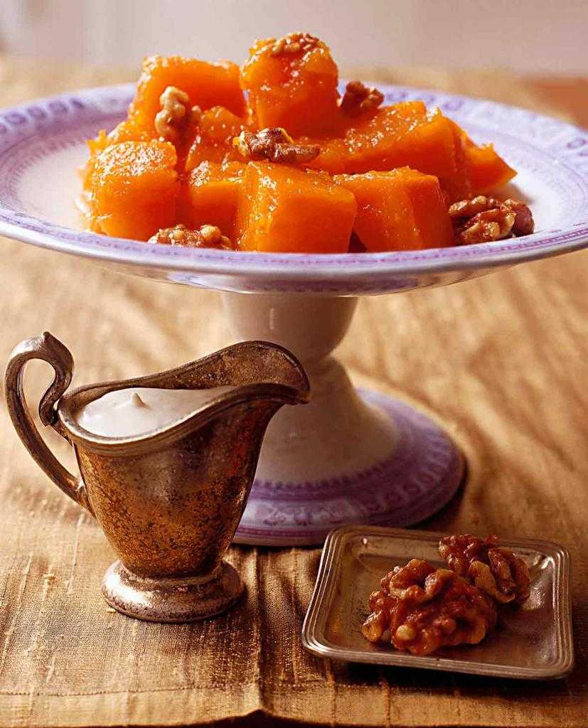- Выложить тыкву в отдельные тарелки, полить сиропом и посыпать поджаренными грецкими орехами.