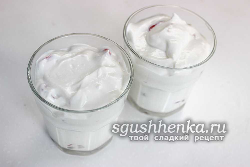 - Сливки взбиваем с сахаром до состояния плотной пены. На это уйдёт примерно 5-7 минут. Приготовленную массу нужно аккуратно переложить в стаканчики. Это будет второй слой.