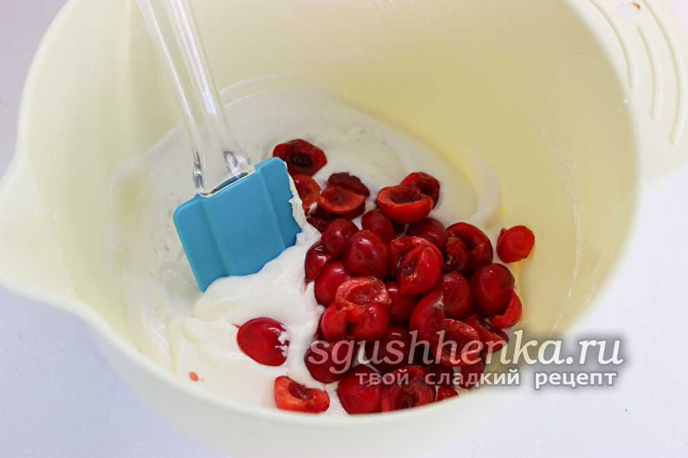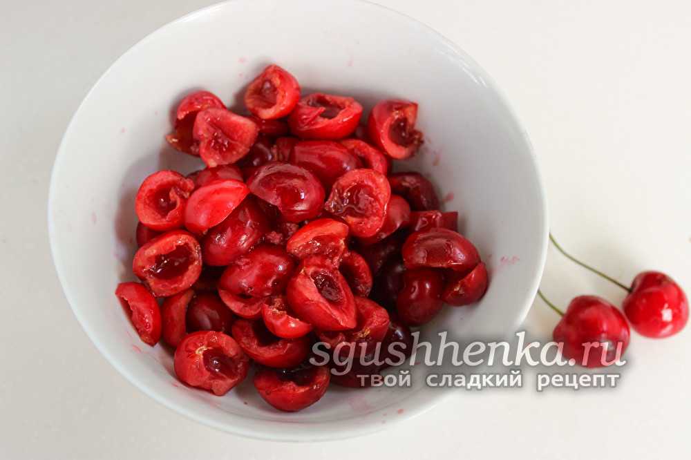 Из вишни удалить косточки. Разложить по всей поверхности крема. Если ягода используется консервированная в собственном соку, можно слегка полить им.