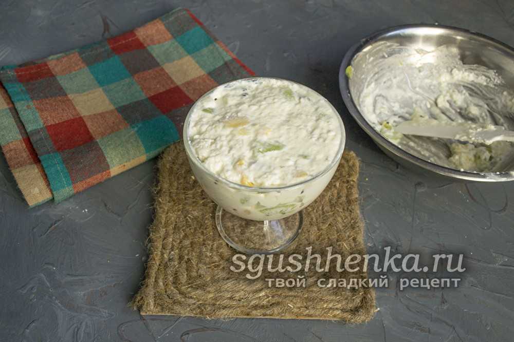 - И перемешиваем его с творожной массой. Затем разливаем по стаканчикам и ставим в холод минимум на три часа или на ночь.