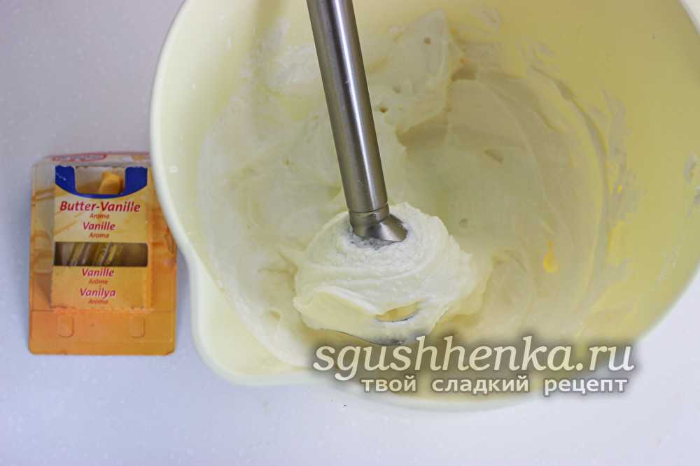 Должна получиться воздушная сливочная масса, похожая на взбитые сливки по консистенции.