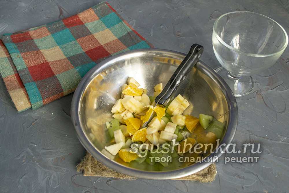 Нарежьте бананы кусочками и смешайте с лимонным сиропом.