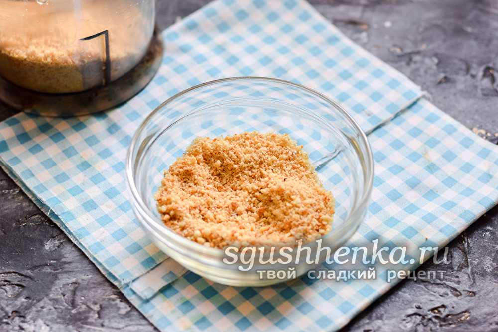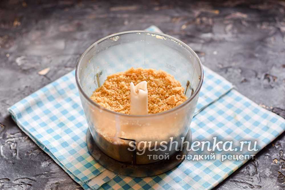 Поместить обломки в чашу блендера, тщательно измельчить. Если кухонного прибора нет, можно насыпать печенье в полиэтиленовый пакет, положить на стол, пройтись несколько раз скалкой, будто раскатывая тесто.