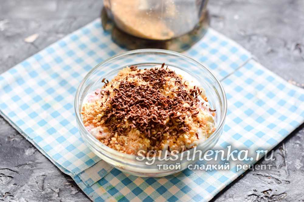 В подготовленные заранее бокалы высыпать третью часть измельченного песочного печенья.