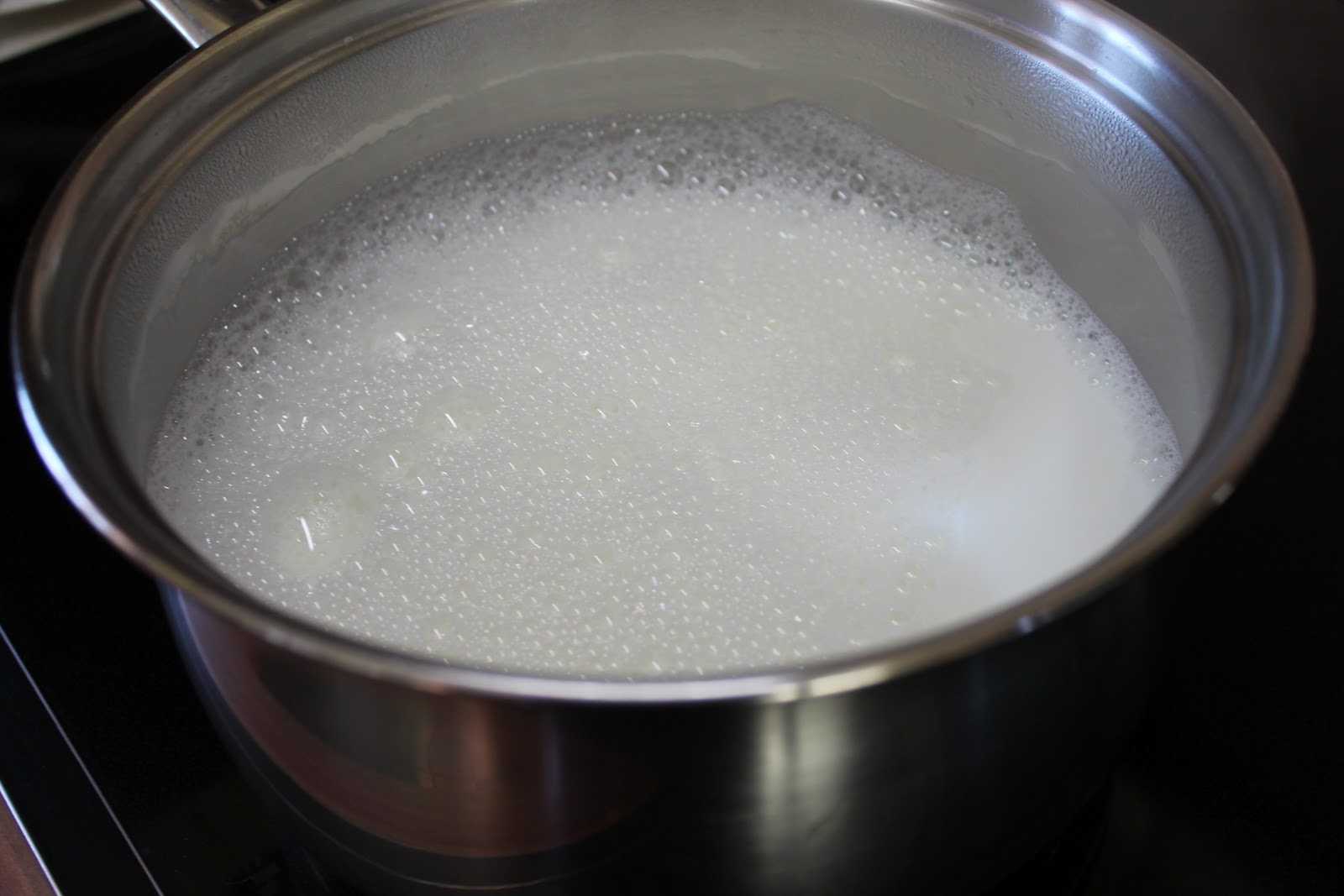 Чтобы приготовить своими руками такой же вкусный десерт, подготовьте кастрюлю. Налейте 250 мл. молока в емкость и поставьте на небольшой огонь. Молоко вскипятите, после чего снимите с плиты. Затем следует оставить горячее молоко остывать до комнатной температуры на 15-20 минут.