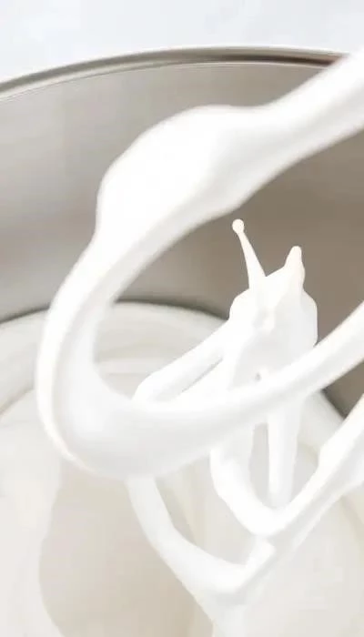 - Продолжайте взбивать до остывания миски и образования устойчивых, блестящих пиков.