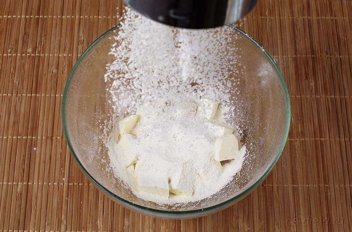 2. Всыпать просеянную муку и руками перетереть все ингредиенты до состояния влажной крошки.
