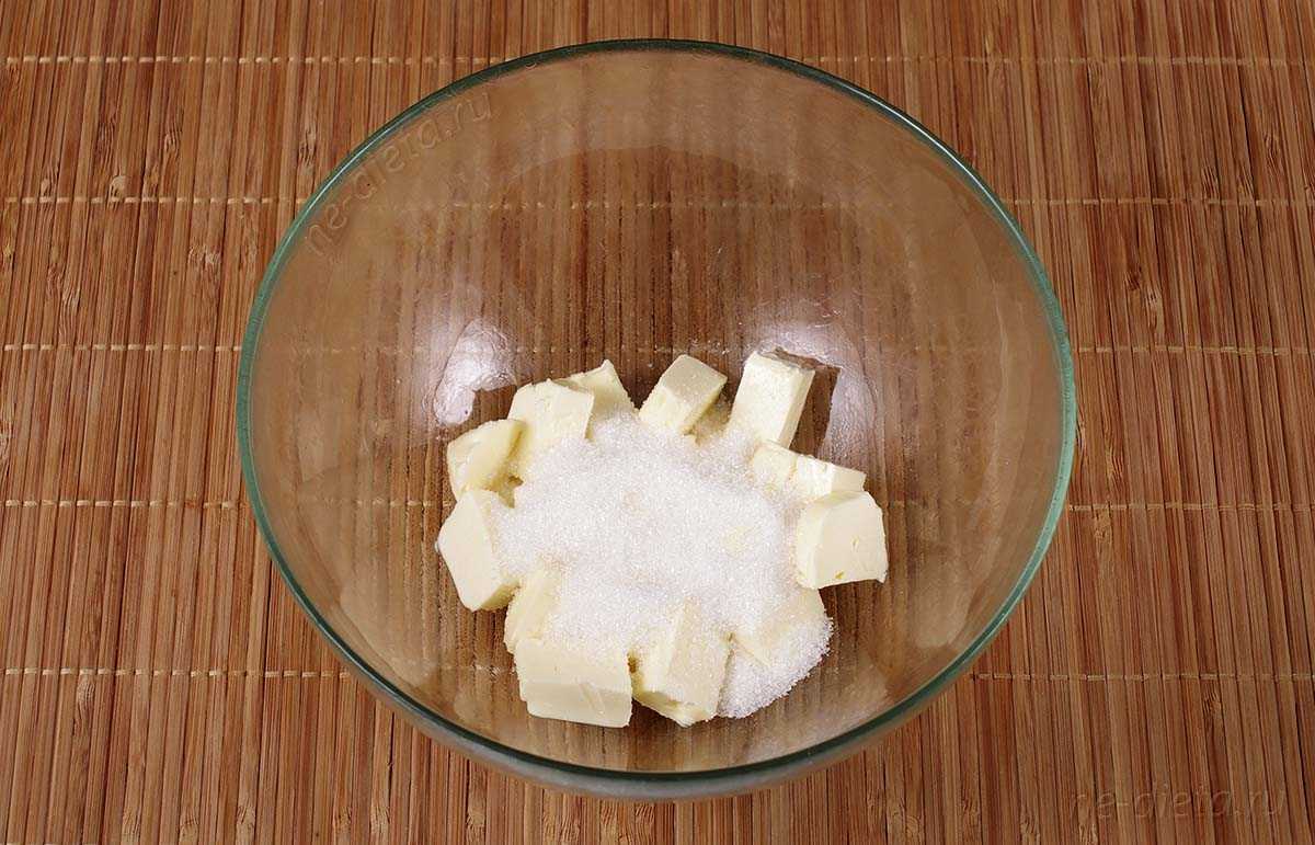 1. Для того чтобы испечь творожный чизкейк с клубникой, вначале приготовим тесто для песочной основы. Для этого в миску выложить размягченное сливочное масло и сахар.