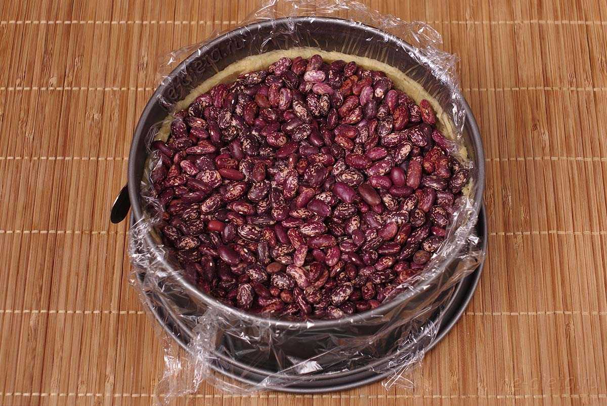 5. Тесто в форме выстелить пергаментом или термостойкой пищевой пленкой и доверху засыпать грузом (фасолью, горохом или специальными шариками для выпечки).