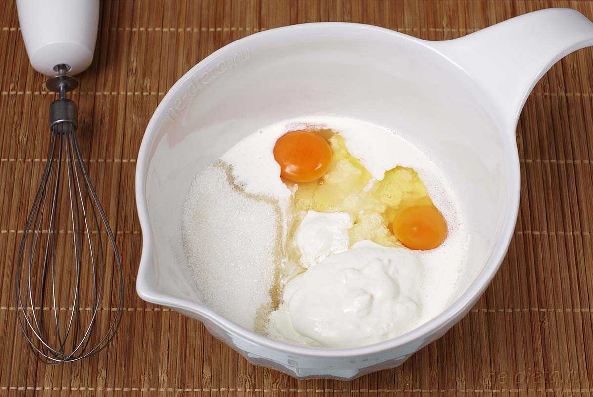 8. К творогу добавить сметану, яйца, сливки, сахар и ваниль.