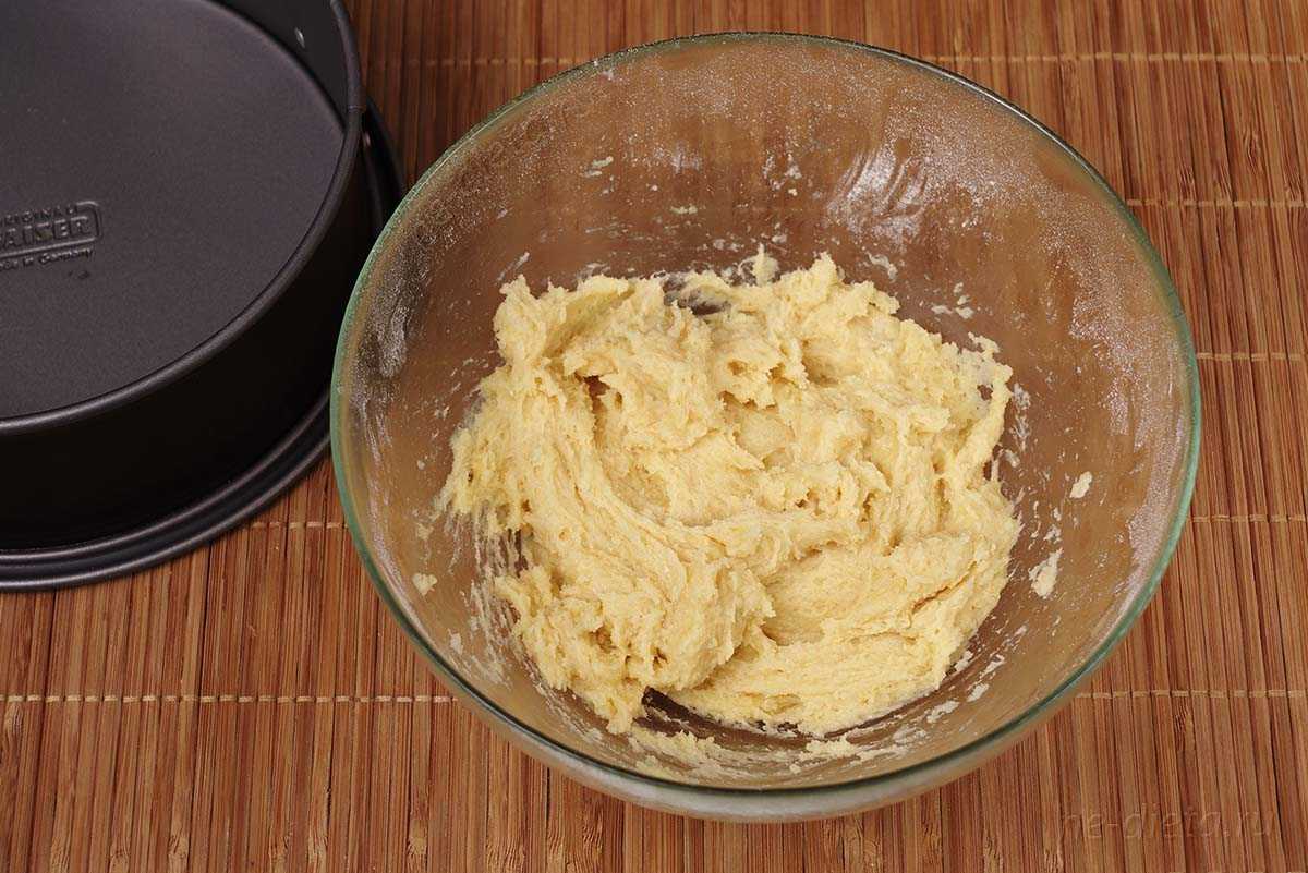 4. Тесто распределить по форме тонким слоем с помощью ложки, сделав высокие бортики. Из данного количества ингредиентов получается чизкейк среднего размера, поэтому берите небольшую форму для выпечки. У меня была круглая разъемная форма диаметром 18 см. Смазывать форму ничем не нужно, так как в песочном тесте содержится большое количество масла.
