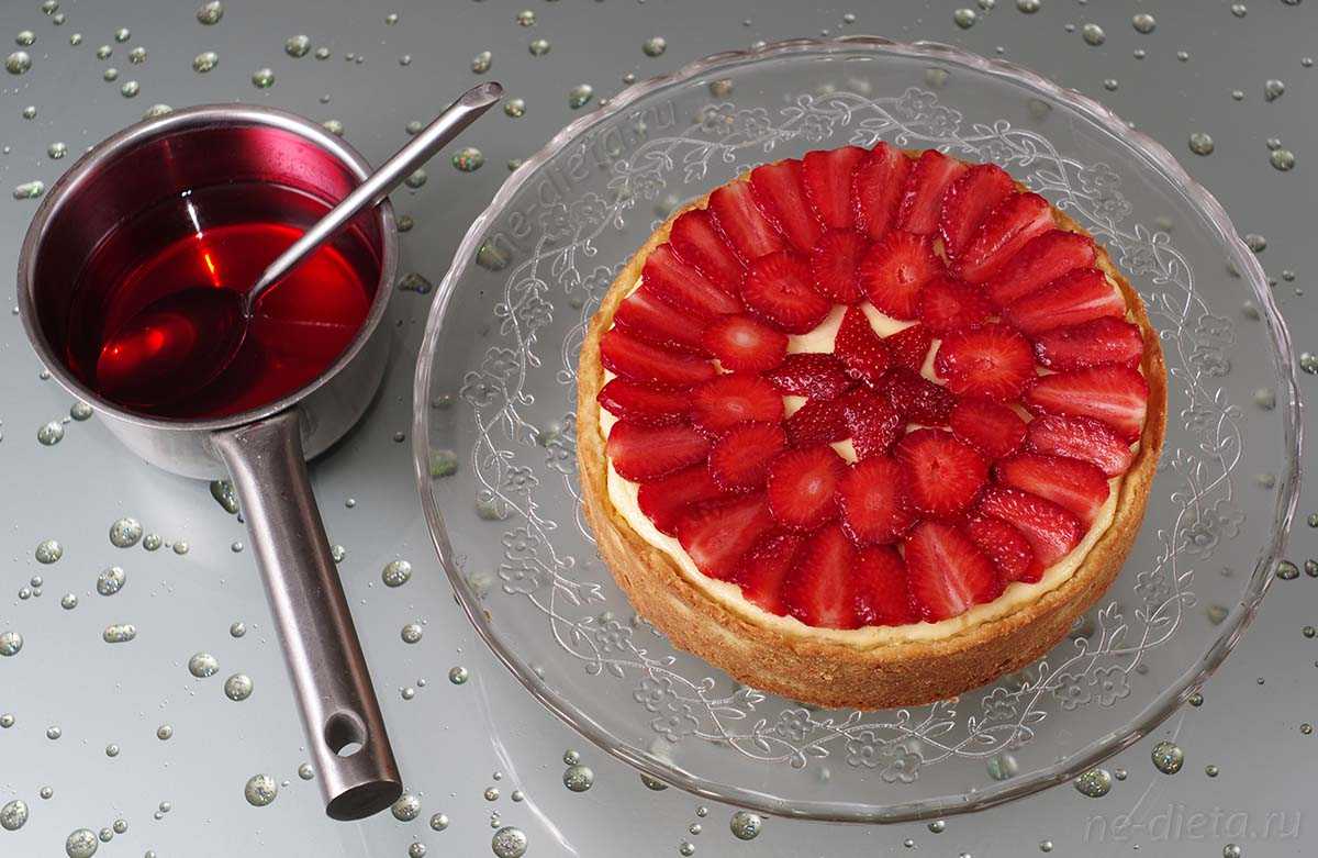 13. Клубнику вымыть, обсушить и выложить на чизкейк целиком или порезанной тонкими пластинками. Желе для торта развести с сахаром и водой согласно инструкции на упаковке и прокипятить в течение 1 минуты.