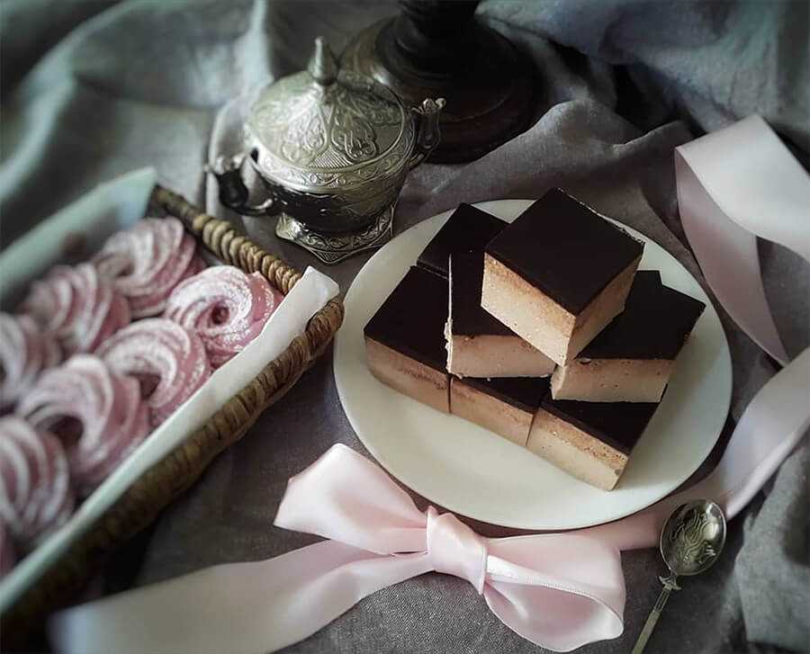 - Готовое птичье молоко нарезаем на одинаковые кубики и глазируем в шоколаде или обваливаем в какао-порошке или ореховой пудре.