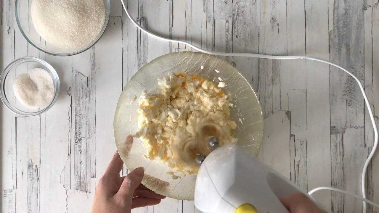 Возьмите ручной венчик или переведите миксер на минимальную скорость. В масляную смесь частями введите перетертый творог.