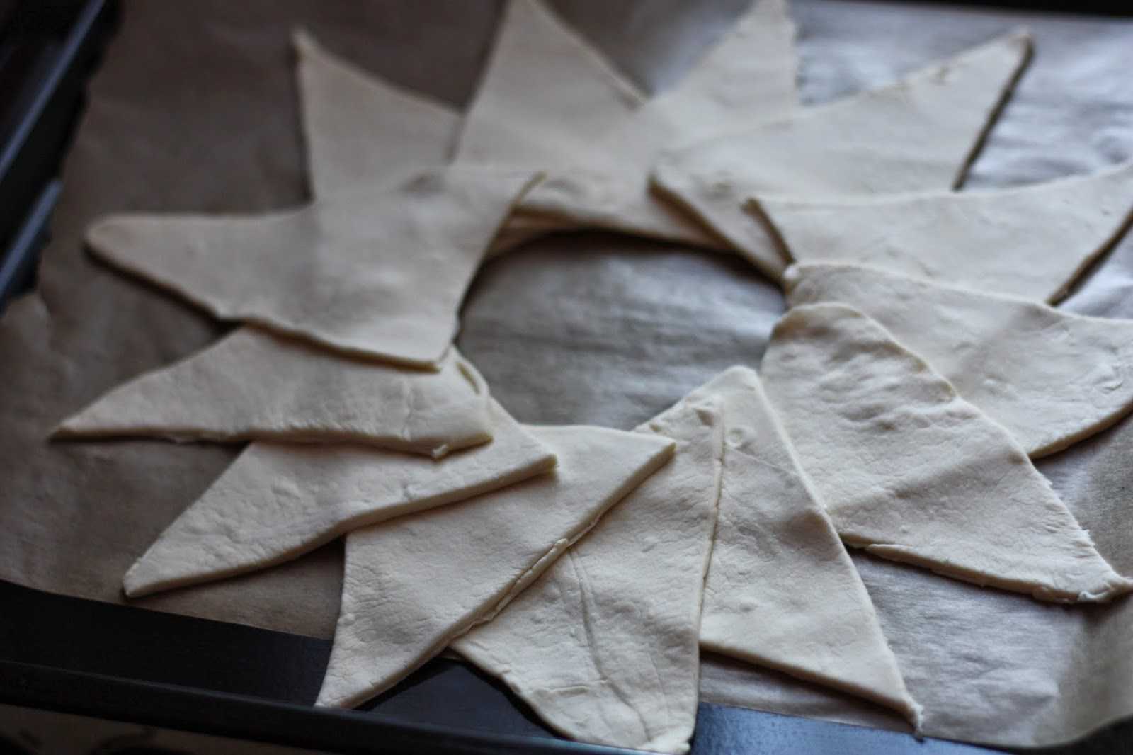 Если подогнуть острый кончик треугольника под круассан при выпечке, то изделие получится более аккуратным.