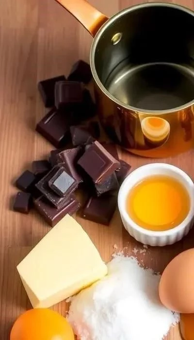 Разогрейте духовку до 200°C. Растопите 100 г темного шоколада и 100 г сливочного масла на водяной бане или в микроволновке, помешивая до однородности. Дайте немного остыть.