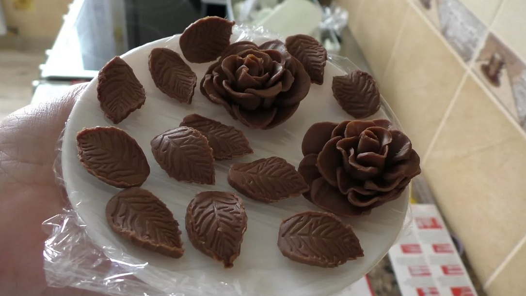 Для сладкого букета нужно несколько цветов и бутонов. Царицу цветов – розочку, можно вылепить из пластичного шоколадного теста или воспользоваться специальной силиконовой формой.