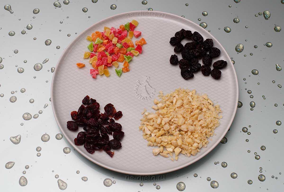 В рецепте я записала сухофрукты. Это значит можно взять любые на свой вкус. У меня цукаты, клюква и папайя.