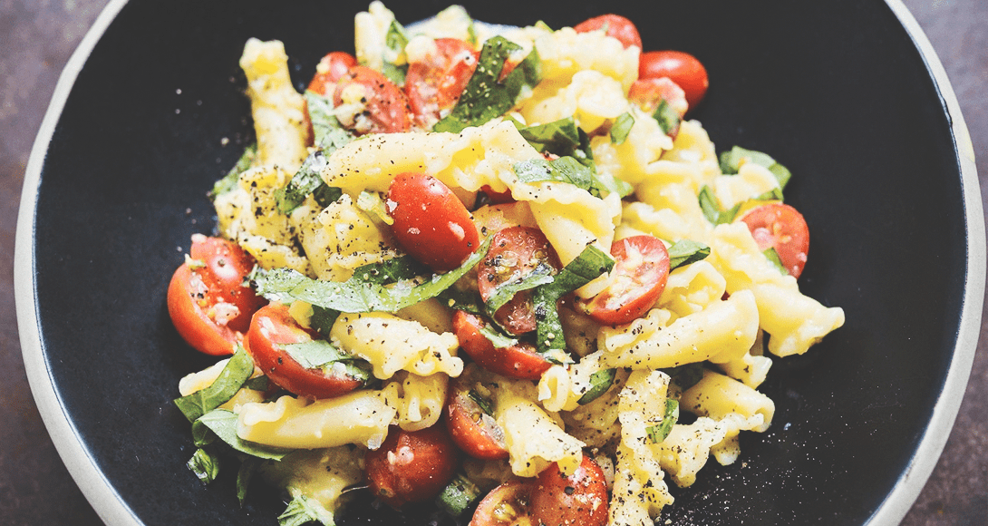 — 4 больших помидора; — 1 пучок зелёного лука; — 300 г макарон «колокольчиков».