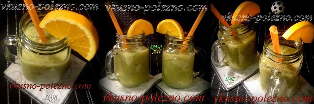 3 фрукта киви1 средний спелый банан1,5 стакан,а апельсинового сока0,5 стакана холодной воды2 чайные ложки мёда (жидкого)6 кусочков льда1 крупный апельсин — для украшения