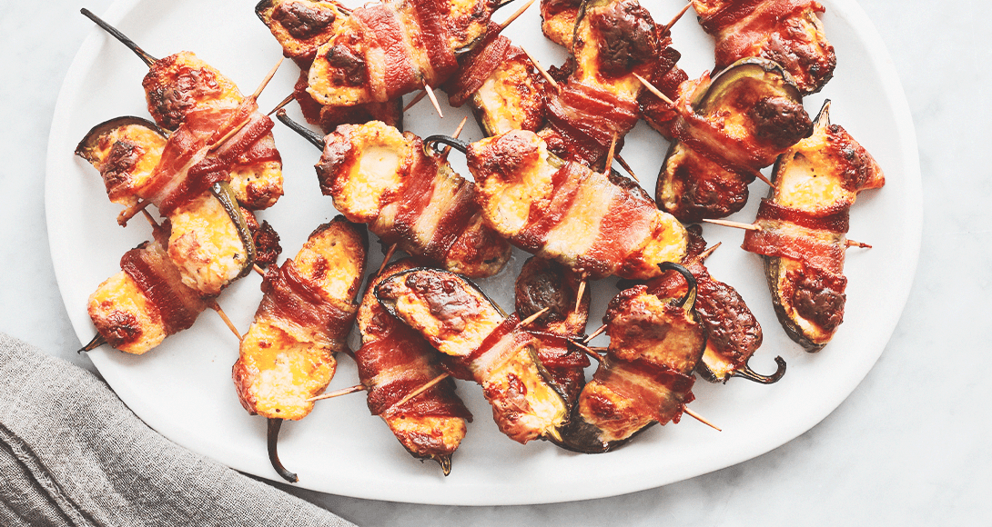 3. Оберни каждый перец беконом. Чтобы бекон не отвалился в процессе приготовления, его можно закрепить зубочистками. Не забудь убрать зубочистки перед употреблением.
