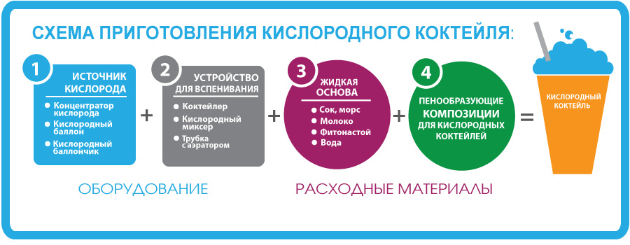 Для приготовления кислородного коктейля понадобятся основа, кислород, пенообразователь, коктейлер или кислородный миксер. Коктейлер – это прибор, в виде емкости с аэратором, регулирующим подачу кислорода, а также концентратором кислорода и краном для выхода напитка. Кислородный миксер тоже отлично справится с этой задачей, в нем можно готовить вкуснейшие коктейли с разным составом.