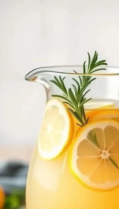 - Охлаждение и подача: Поставьте лимонад в холодильник на 30 минут, чтобы он охладился. Подавайте со льдом, украсив дольками лимона и веточками розмарина.