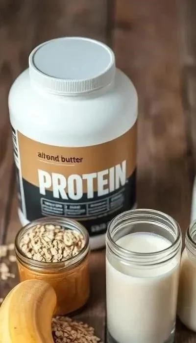 - Ингредиенты: 350 мл несладкого миндального молока, 2 мерные ложки сывороточного протеина (шоколад или ваниль), 1 замороженный банан, 2 столовые ложки натурального арахисового масла.