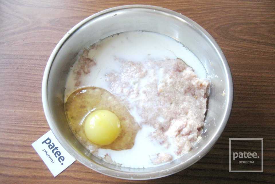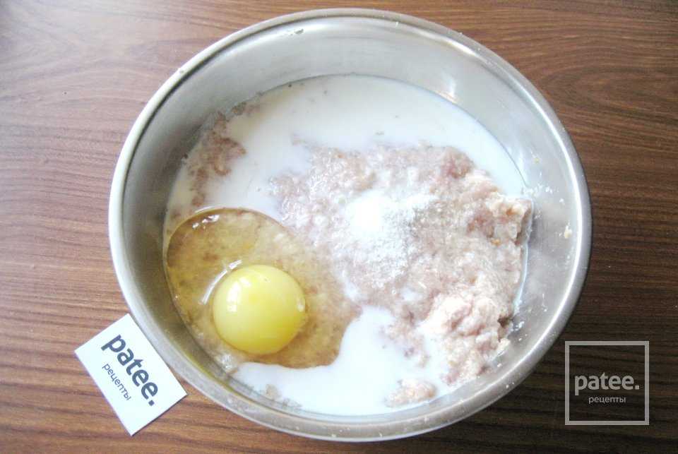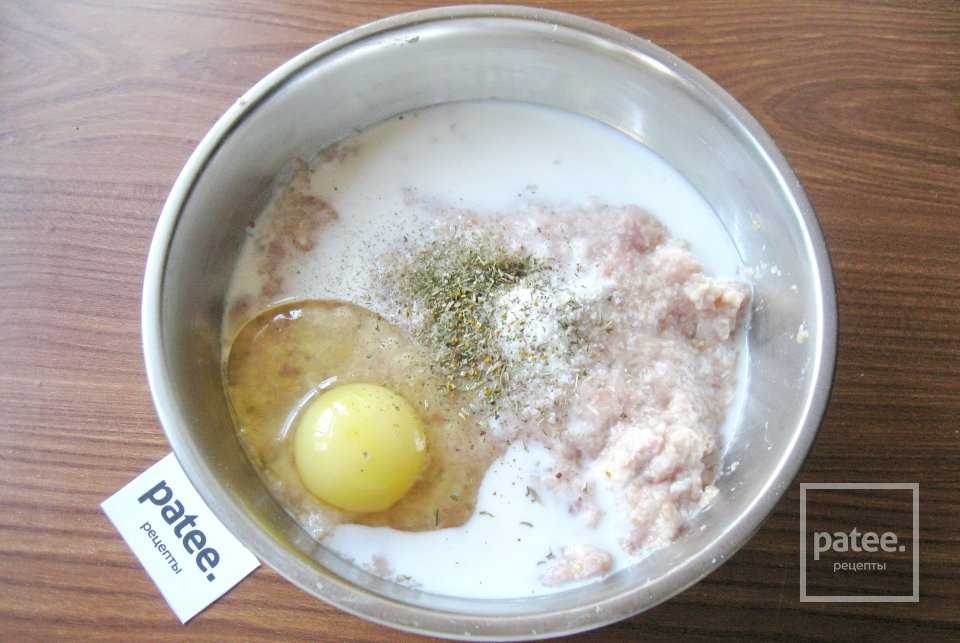 3. Следующим вбиваем одно небольшое яйцо. Куриный фарш солим, перчим, добавляем молоко, кориандр и черный перец.