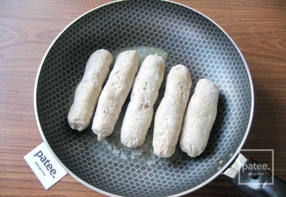 9. И в завершение, ставим на огонь сковороду с небольшим количеством растительного масла. Когда оно хорошо нагреется, выкладываем сосиски и обжариваем до красивой румяной корочки.