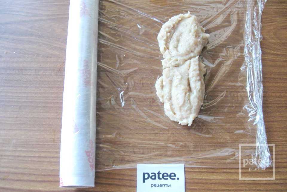 Сформировать из полученного фарша колбаски. Для этого выложить две столовые ложки фарша на пищевую пленку. Завернуть фарш в несколько слоев пленки.