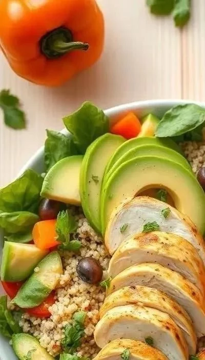 Приготовление: Курицу обжарить на оливковом масле до готовности. Киноа отварить согласно инструкции на упаковке. Брокколи приготовить на пару. Смешать все ингредиенты и добавить специи.