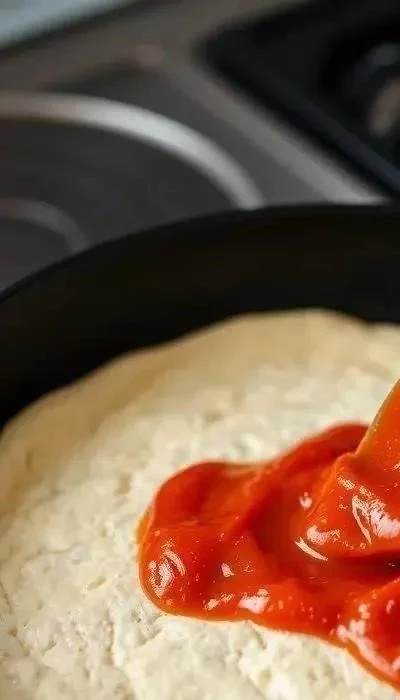 Этап 2: Формирование пиццы. Смажьте сковороду растительным маслом и выложите на нее тесто, равномерно распределив его по всей поверхности. Сформируйте бортики, чтобы начинка не вытекала. Смажьте тесто кетчупом или томатным соусом. Помните, что сковорода должна быть на маленьком огне.
