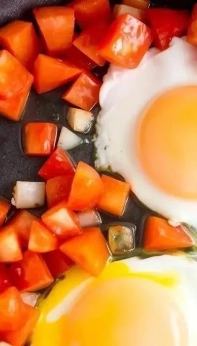 - Приготовление: Нарежьте помидор и лук кубиками. Обжарьте лук на растительном масле до золотистого цвета. Добавьте помидор и жарьте еще 2-3 минуты. Разбейте яйца в сковороду, посолите, поперчите и жарьте до готовности белка. Посыпьте зеленью.