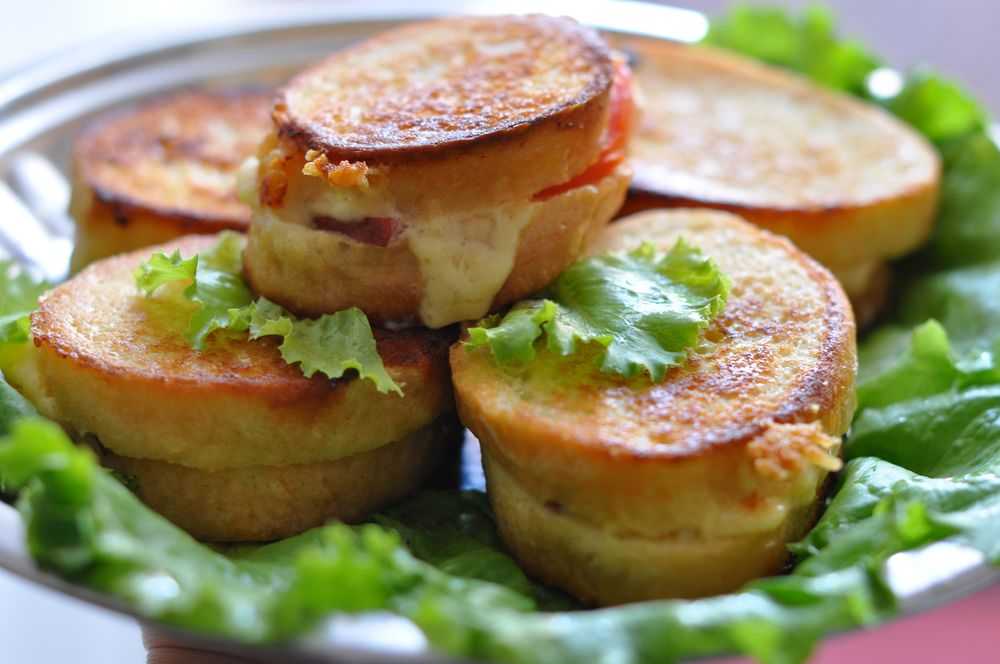 Горячие бутерброды с колбасой, картофелем и сыром готовы. Подаем с чаем или кофе.