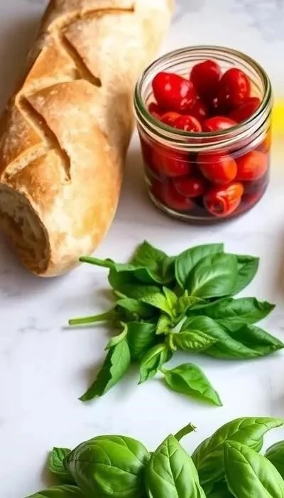 Приготовление домашнего соуса песто займет около 15-20 минут. В блендере смешайте 2 пучка базилика, 50 г кедровых орешков, 2-3 зубчика чеснока, 50 г пармезана, 100 мл оливкового масла и щепотку соли. Взбивайте до однородной массы. Подготовка вяленых томатов и хлеба: Нарежьте багет тонкими ломтиками и слегка подсушите в духовке или на сковороде. Вяленые томаты нарежьте небольшими кусочками. Этот этап займет около 10 минут.