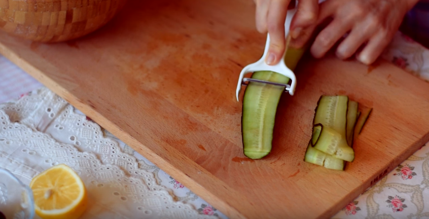 4. Огурец нарезаем тонкими пластинками с помощью специального ножика (обычным ножом добиться такой тонкости не получится).