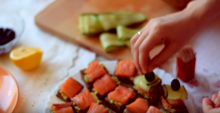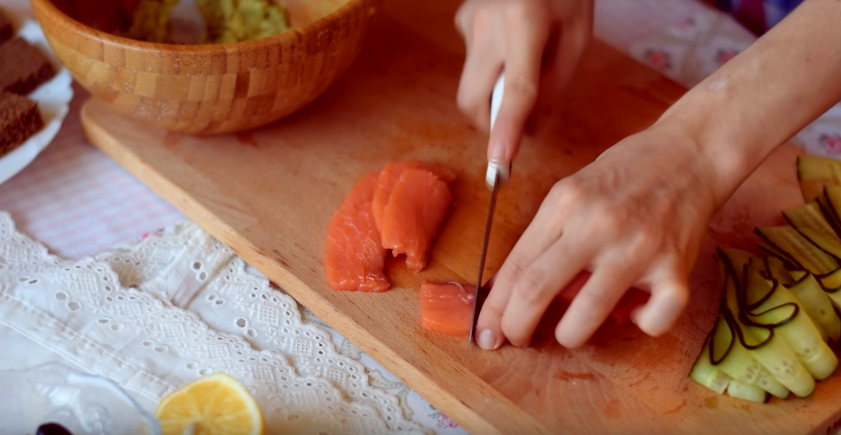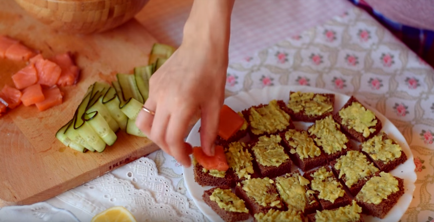 6. Собираем канапе. На хлеб намазываем мякоть авокадо, сверху кладем кусочек рыбы.