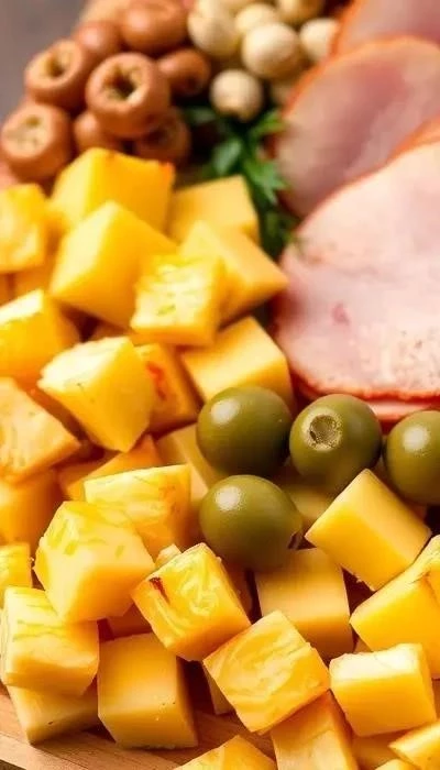 Сыр (опционально): Если вы решили добавить сыр, выбирайте твердые или полутвердые сорта, такие как чеддер, гауда или эмменталь. Сыр должен хорошо сочетаться с ветчиной и ананасом, не перебивая их вкус. Небольшие кубики сыра добавят канапе текстуры и пикантности.