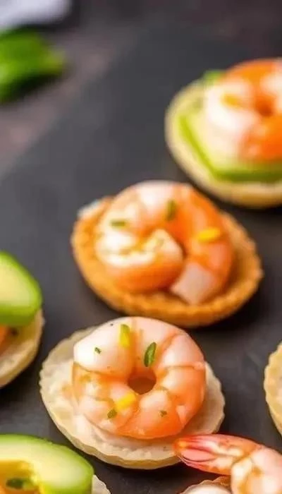 Канапе с креветками, киви и авокадо: Добавьте ломтик спелого авокадо к классическому сочетанию креветок и киви. Авокадо придаст канапе кремовую текстуру и нежный вкус, прекрасно дополняя морепродукты и фрукты. Для этой вариации можно использовать хлеб с добавлением цельнозерновой муки.