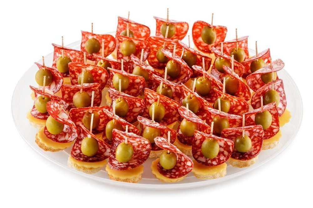 - Не возбраняется включать в состав канапе креветки, вареные куриные или перепелиные яйца, бекон, смешанный с чесноком и майонезом сыр, зеленый горошек, сосиски, копчености.
