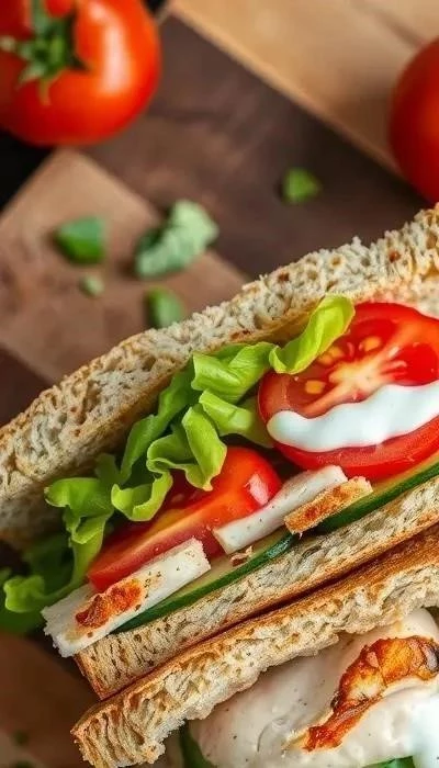 Влияние ингредиентов на вкус и пользу: Куриная грудка – источник белка, необходимого для поддержания энергии и здоровья мышц. Помидор и огурец богаты витаминами и минералами, а также содержат антиоксиданты. Салат – источник клетчатки, которая улучшает пищеварение. Цельнозерновой хлеб обеспечивает организм сложными углеводами, которые дают длительное чувство сытости. Йогуртовый соус – легкий и полезный источник кальция и пробиотиков. Этот сэндвич – идеальный выбор для тех, кто следит за своим здоровьем и фигурой.